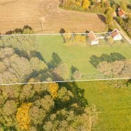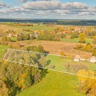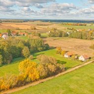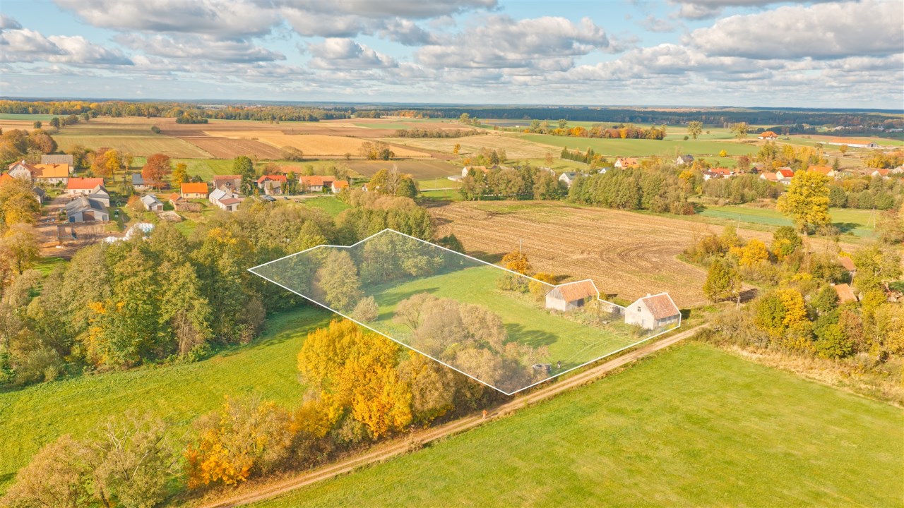 Oferowana nieruchomość obejmuje dwa budynki – dom mieszkalny oraz budynek gospodarczy – a także pozostałości trzeciego budynku, który niegdyś łączył dom ze stodołą. Całość posadowiona jest na dwóch działkach gruntu o numerach ewidencyjnych 24/2 o powierzchni 1200 m² oraz 24/3 o powierzchni 8000 m², co łącznie daje 9200 m² powierzchni terenu.