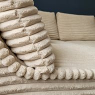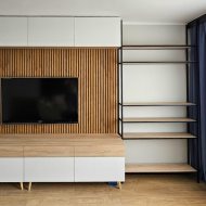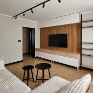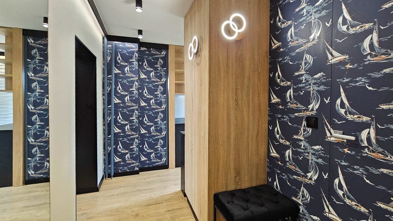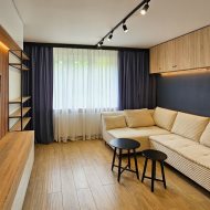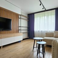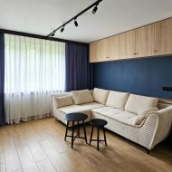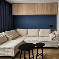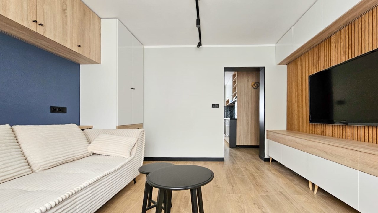 W salonie pełniącym funkcję sypialni znajduje się rozkładana kanapa z funkcją spania, nowoczesna zabudowa z lamelami oraz meblami ze stalowymi elementami. Mieszkanie sprzedawane jest z pełnym umeblowaniem, w tym z tekstyliami, zasłonami, firanami i nowym kompletem pościeli.