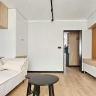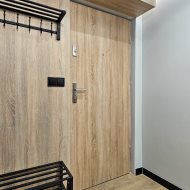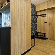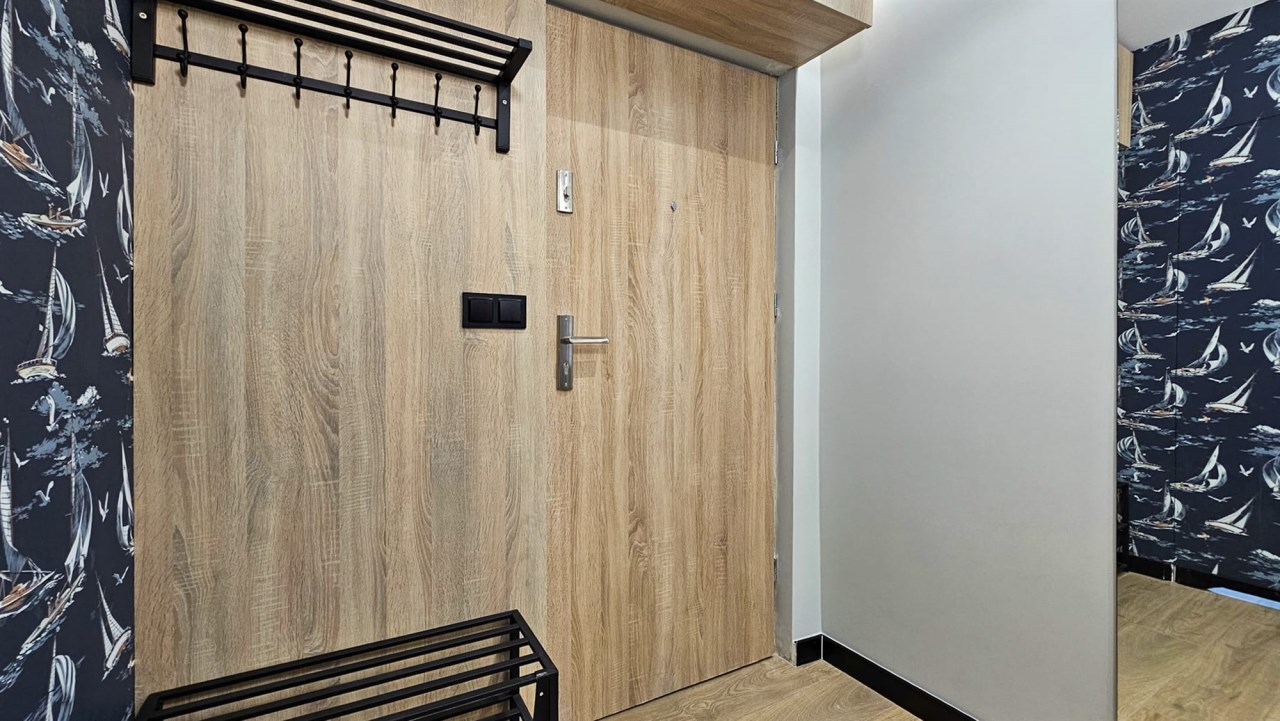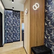 Z korytarza wydzielono dodatkowe małe pomieszczenie z przesuwanymi drzwiami, które pełni funkcję składziku, ale może również zostać wykorzystane jako przestrzeń dla rozkładanego łóżka.