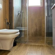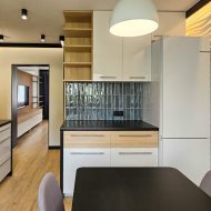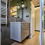 Funkcjonalna łazienka została wykończona z dużym wyczuciem stylu. Znajduje się tu prysznic typu walk-in, toaleta z bidettą, umywalka z szafką oraz zabudowa ścienna wykonana na wymiar. W łazience zamontowano termę o pojemności 80 litrów.