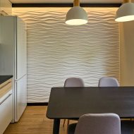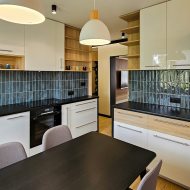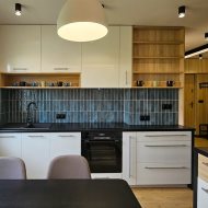 Wnętrze zaprojektowane zostało w nowoczesnym stylu z delikatnymi akcentami żeglarskimi, które podkreślają lokalny klimat i nawiązują do mazurskiego charakteru regionu. Jasna kuchnia z funkcją jadalni wyposażona jest w nowe meble wykonane na wymiar, a także wysokiej klasy sprzęt AGD: lodówkę, piekarnik, płytę grzewczą, okap oraz ekspres do kawy. Znajdziemy tu także stół z krzesłami i niezbędne akcesoria kuchenne.